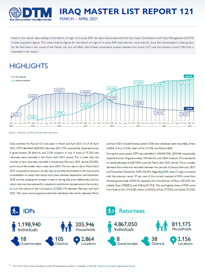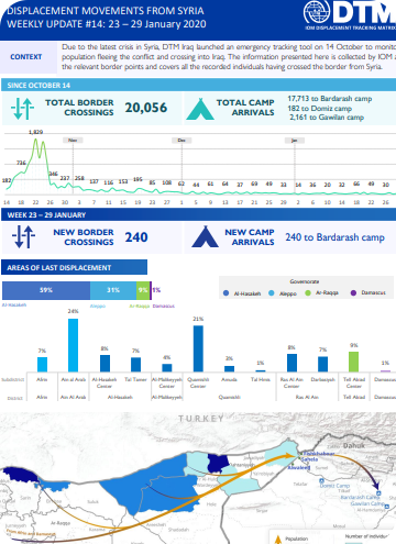 The Displacement Tracking Matrix (DTM) is IOM’s information management system to track and monitor population displacement during crises. Composed of a variety of tools and processes, the DTM regularly captures and processes multi-layered data and disseminates a wide array of information products that facilitate a better understanding of the evolving needs of a displaced population, be that on site or en route...
